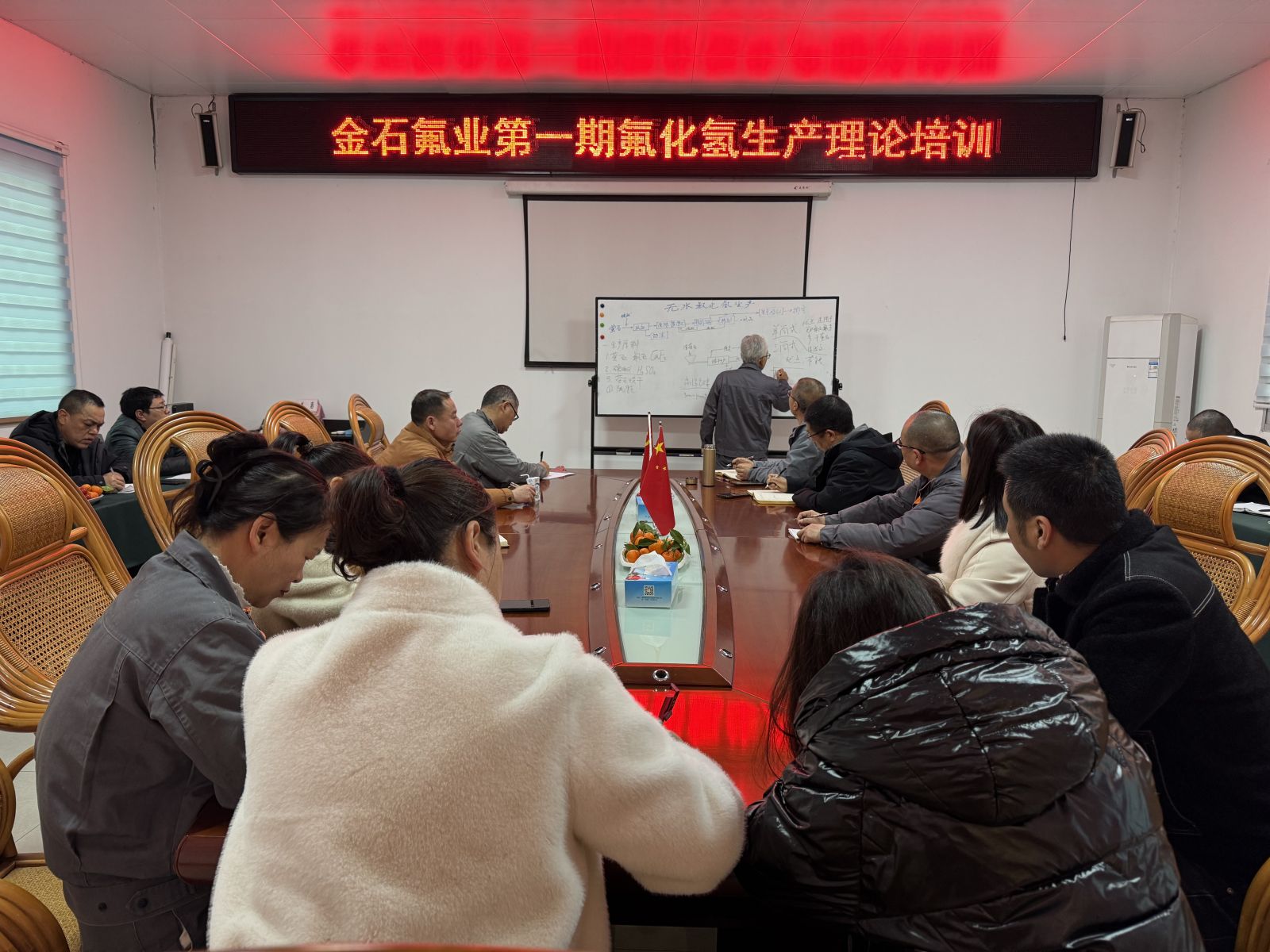 此次培訓由在氟化工企業(yè)工作35年的高級工程師賀志榮授課,主要講解“氟化氫生產(chǎn)理論”等方面的課程,賀工全面、系統(tǒng)地講述了公司產(chǎn)品的相關(guān)原理及在工藝制造過程中的注意事項和解決方法。