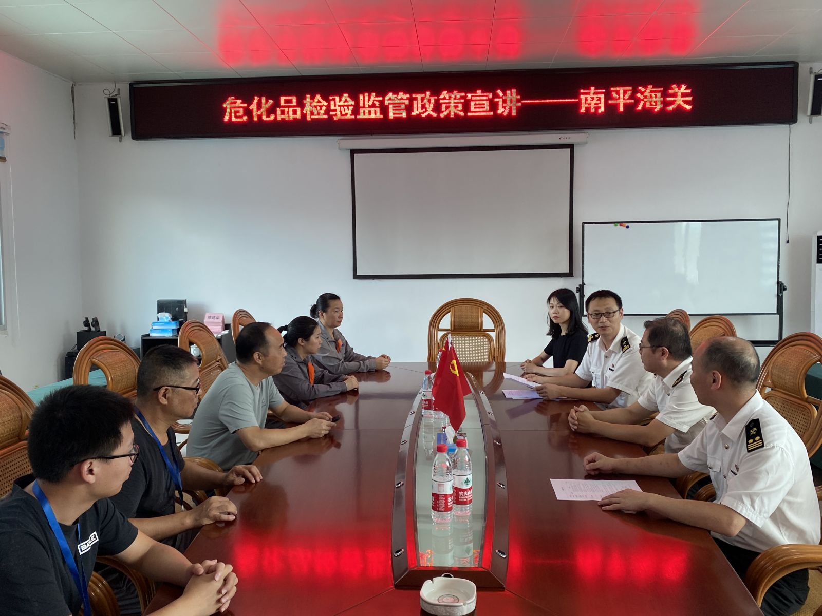 2021年07月20日上午10:00左右,南平海關(guān)副關(guān)長陳俊穎、南平海關(guān)查驗(yàn)科一科領(lǐng)導(dǎo)黃云好、林鼎杰一行蒞臨我司做危化品檢驗(yàn)監(jiān)管政策宣講、?;窐I(yè)務(wù)交流及管理體系認(rèn)證審核。